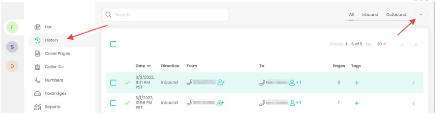 Fax history is accessible by clicking the “history” option on the left panel