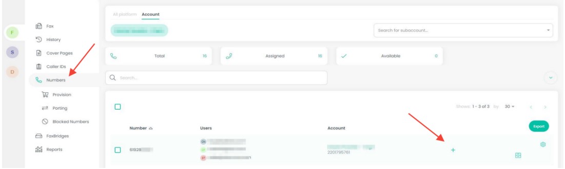 You can also add tags to numbers on your account. You can add tags to a number by navigating to your numbers tab and selecting the plus like shown in the screenshot below on the number you'd like to add a tag for. You will be able to add a current tag to your number or select the green plus on the right hand side to create a new tag. Once you have added a tag to a number, all inbound faxes received to that number will have your tag added to that fax.