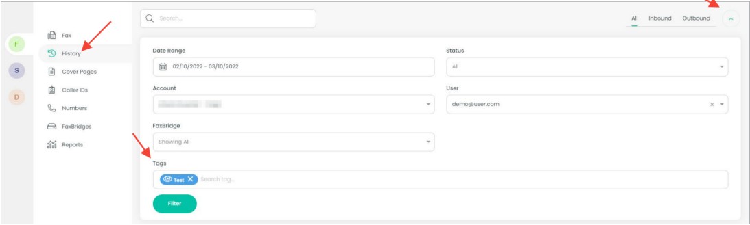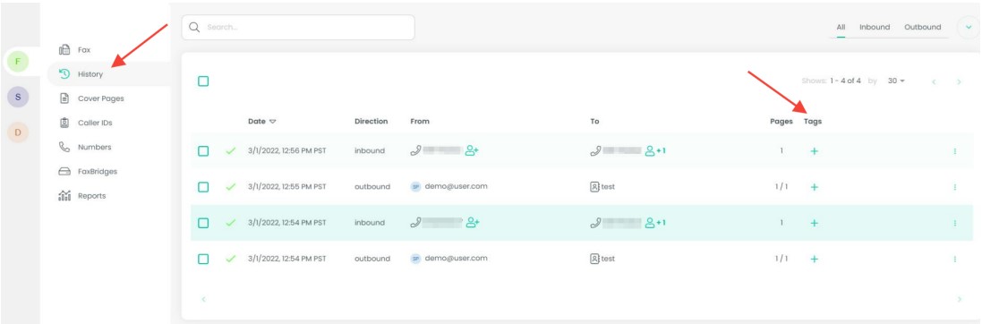 You can also tag faxes by navigating to your history tab on the portal and you will see a tags column shown in the screenshot below. Click the '+' symbol.