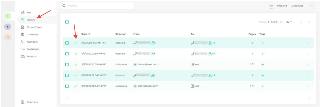 Checking the status of a fax can be done by looking on the History page. This page is accessible from the main view: