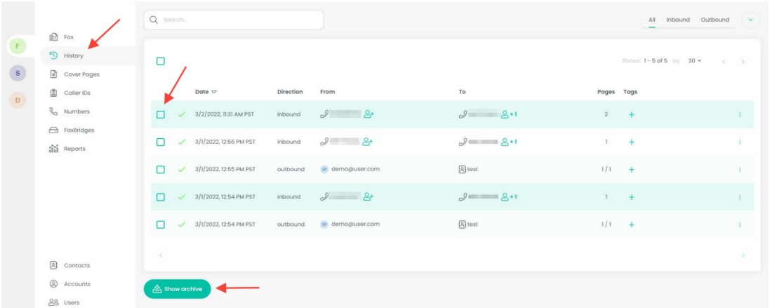 Select the checkbox by the fax you would like to delete, select archive then select show archive at the bottom.