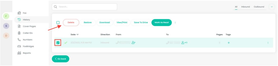 Select the check box for the fax you would like to delete then select delete at the top.