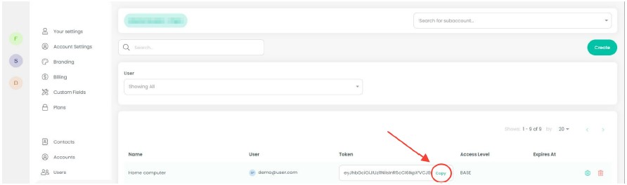 At the end of the installation process you will be prompted to enter an Authorization Key (Token). This token can be created from the web portal in Settings > API Keys (see screenshots below). Click the Create button: